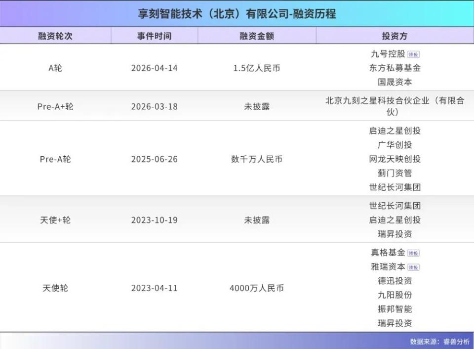 2026 年 4 月 14 日,享刻智能宣布完成 1.5 亿元 A 轮融资,由九号公司战略领投,长沙东方私募基金、江苏国晟资本等跟投。算下来,公司三年拿了 5 轮融资,累计近 3 亿元。