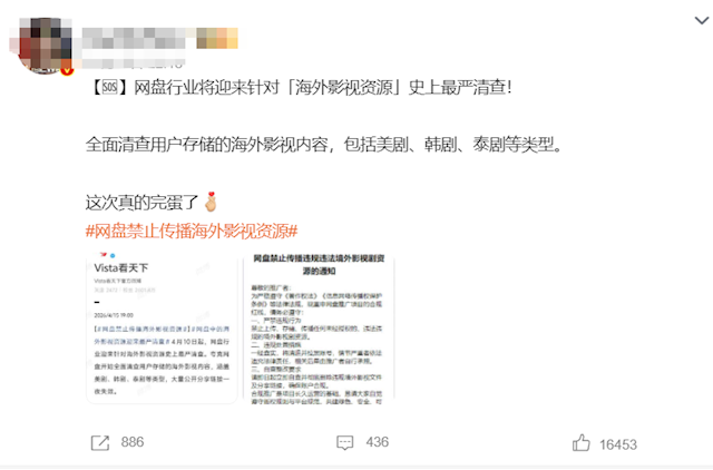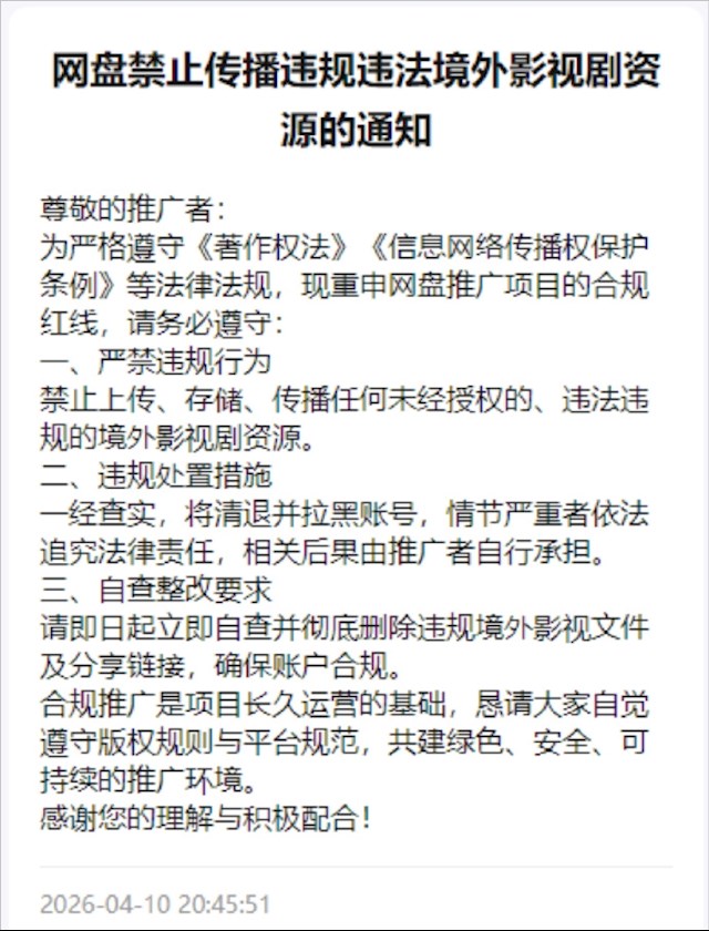 从一份网传通知显示,为严格遵守《著作权法》信息网络传播权保护条例》等法律法规,要求禁止上传、存储、传播任何未经授权的、违法违规的境外影视剧资源。一经查实,将清退并拉黑账号,情节严重者依法追究法律责任,相关后果由推广者自行承担。
